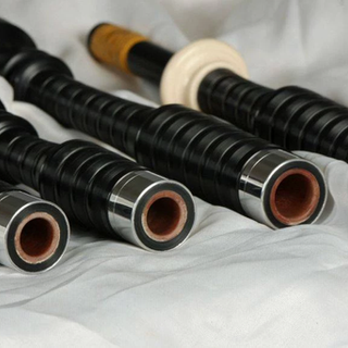 We also recognize that Delrin, (also known as Acetal or Polypenco) is widely used in the manufacture of chanters and have proven themselves at the highest level of competition. Delrin drones, however, can be more challenging. Many maintain that the sound is loud and unrefined. In order to address this, we looked for uncommon solutions. After months of research and development, we have created a Delrin instrument with an internal design that overcomes the short-comings of traditional bores. We found that by changing the bore sizes and by lining the bores with a cellulose polymer sleeve, we were able to produce an instrument with all the structural benefits of Delrin that produced a refined "wood-like" sound. Many hours were spent experimenting and fine-tuning the bore dimensions and bell design. Our patience and persistence has been rewarded with a subtle and warm drone sound, rich in harmonics and stability. An added bonus of the polymer sleeve is that it absorbs moisture, helping to keep your reeds dry and stable.